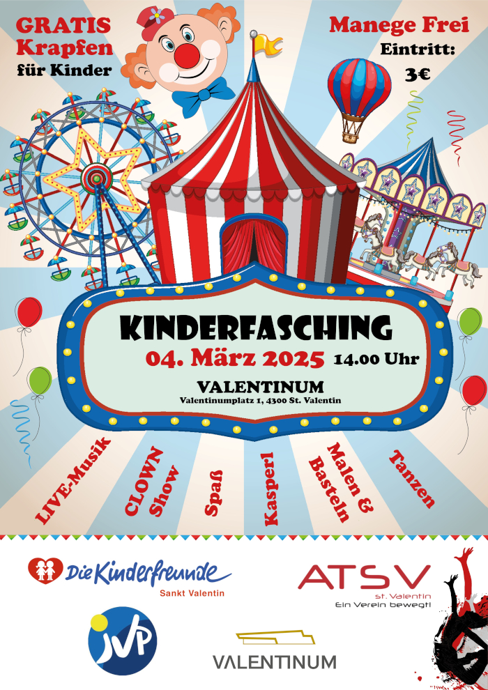 Was gibt es Schöneres als sich in der Faschingszeit zu verkleiden. Jedes Jahr freuen sich die Kinder auf den Kinderfasching in Sankt Valentin. Auch dieses Jahr veranstalten die JVP, die Kinderfreunde Sankt Valentin und der ATSV Sankt Valentin den Kinderfasching gemeinsam am Faschingsdienstag. Ein lustiges und buntes Programm wartet auf die Kinder.