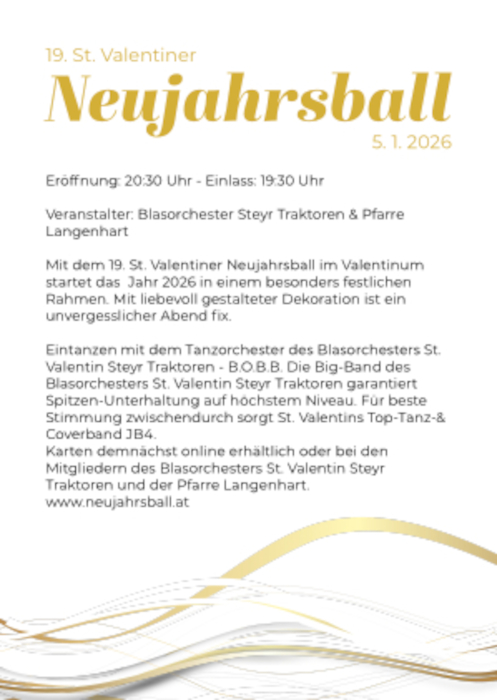 Wer eine große Veranstaltung plant, bei der bis zu 1000 Personen erwartet werden, mietet das gesamte Valentinum mit dem großen Saal. Genug Platz für jedes Konzert, jede Hochzeit und Firmenfeier.