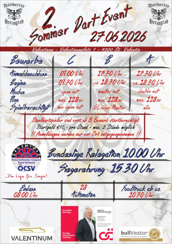 Am 27. Juni 2026 lädt der Dartverein Herzograd zum zweiten Sommer Dart Event in das Valentinum in Sankt Valentin ein. Ab 08:00 Uhr öffnet die Veranstaltung ihre Türen, bevor ab 09:00 Uhr die ersten Bewerbe starten. Gespielt wird in den Kategorien C, B und A, jeweils mit maximal 128 Teilnehmern und Teilnehmerinnen. Der Modus reicht von "open out" bis "master out", je nach Bewerb. Steeldartspieler und Steeldartspielerinnen steigen ab dem B-Bewerb ein. Das Startgeld beträgt 10 Euro pro Stand, wobei maximal zwei Stände möglich sind Die Anmeldung erfolgt ausschließlich vor Ort.