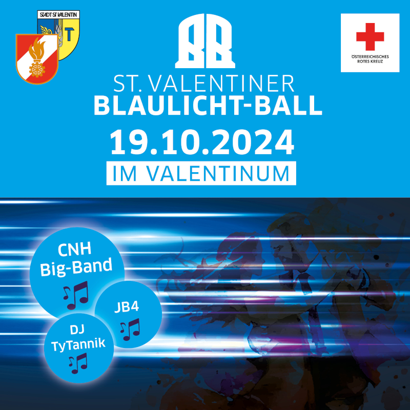 Die Freiwillige Feuerwehr und Das Rote Kreuz St.Valentin veranstalten am 19. Oktober den Blaulichtball! Nach großem Erfolg letzten Jahres findet auch heuer der Ball im Veranstaltungszentrum Valentinum statt. Für den entsprechenden Sound wird die CNH Bigband zusammen mit JB4 sorgen. Die Eintrittskarten kann man an den Dienststellen der jeweiligen Blaulichtorganisation erwerben. Mit dem Reinerlös der Veranstaltung wird die Mannschaftsausrüstung von Rettung und Feuerwehr modernisiert. Lassen Sie sich dieses gesellschaftliche Highlight nicht entgehen, tun Sie sich und der Allgemeinheit etwas Gutes!
